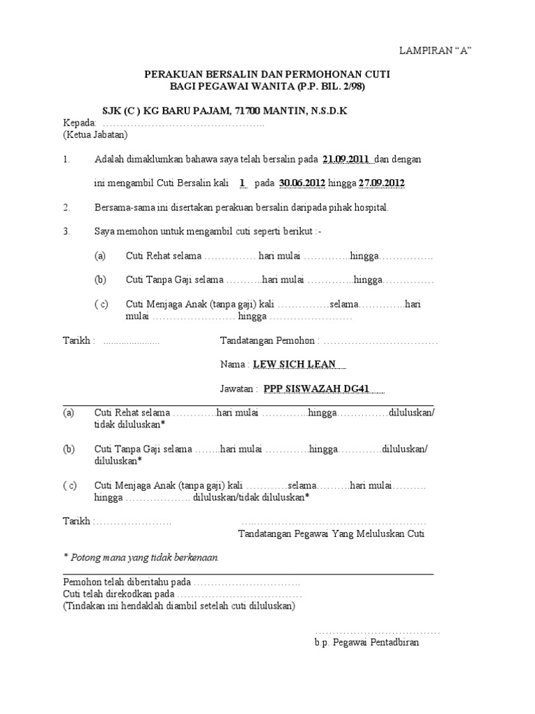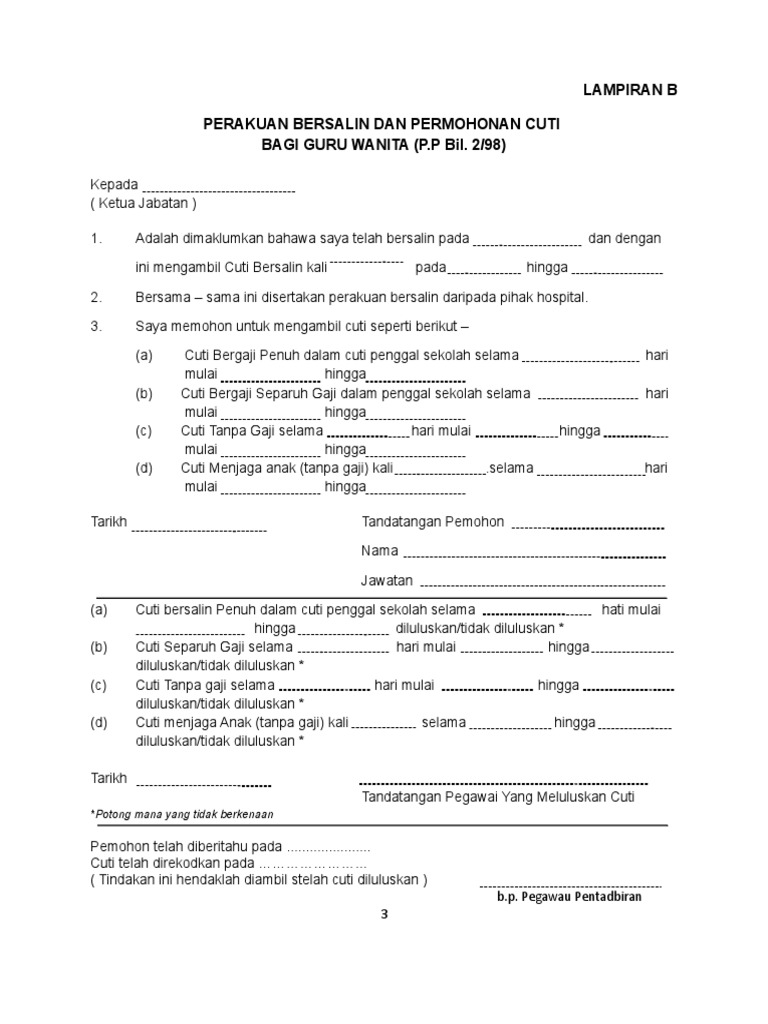 Lampiran B Cuti Bersalin : Pekeliling cuti bersalin kerajaan 2021:. Borang kemudahan cuti bersalin pegawai perkhidmatan awam arahan: Dengan surat ini saya mengajukan permintaan cuti bersalin untuk persalinan yang ke ii/cuti di luar tanggungan negara untuk persalinan *), terhitung mulai tanggal 12. Cuti bersalin tidak boleh lewat daripada hari berikutnya selepas seseorang pekerja wanita itu bersalin. Hak ini disebut dengan cuti bersalin. Cuti bersalin untuk persalinan keempat dan.
